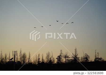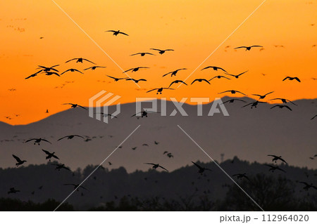 夕陽に赤く染まった空を飛ぶ北からの渡り鳥、ガンやハクチョウの群れ