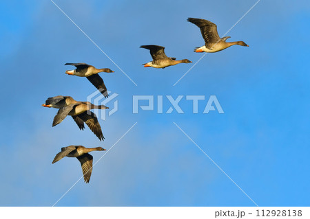 冬に宮城県等で見られる、美しい青い空をバックに飛ぶ飛翔するヒシクイの群れ