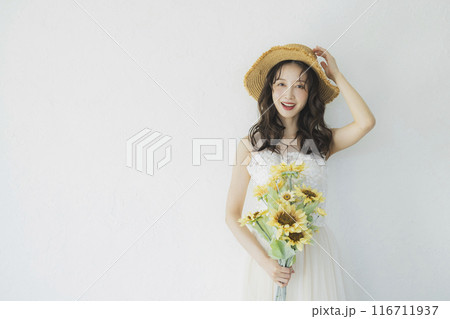 ウェディングドレスを着たひまわりを持つ女性