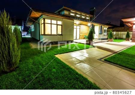 Detached house at night view from outside the rear courtyard.