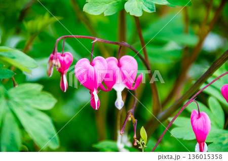 一列に並んだハート形の薄ピンクのタイツリソウの花 ロンドン郊外のイーストコート・ハウス・ガーデンにて