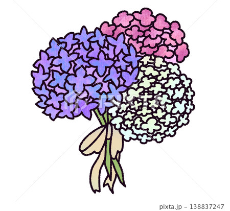 あじさいのブーケイラスト 紫・ピンク・白 梅雨 6月の花 手書き風 白背景