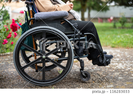 Elderly woman in a wheelchair enjoying a sunny day in a beautiful garden full of greenery and