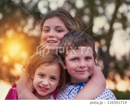Kids, portrait and siblings hug in a garden with love, trust and bonding on vacation at sunset. Happy, face and children in a backyard with costume for games, fun and Halloween in the neighborhood