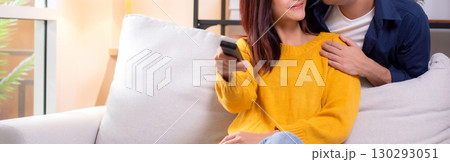 Happy young asian couple sitting on cozy sofa watching TV together and enjoying a relaxation.