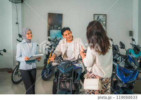 veiled saleswoman and man smile as girlfriend shows thumbs up in showroom