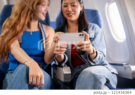 Happy Asian female friends enjoying watching a movie on a smartphone together during the flight.