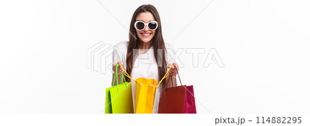 Shopping, leisure and lifestyle concept. Portrait of excited happy young girl likes shop, attend favorite mall, got lots of new clothes, bragging it, open up bag to show friend, smiling enthusiastic