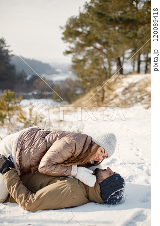 Portrait of romantic couple having fun on winter walk. Man and woman lay on a snow together and kissing. Family wearing warm jacket and knitted hats.