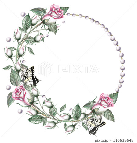Round frame of rose buds and pearls in watercolor illustration. Hand drawn watercolor drawing for wedding invitations, congratulations, gifts, memorable dates. Composition isolated from background