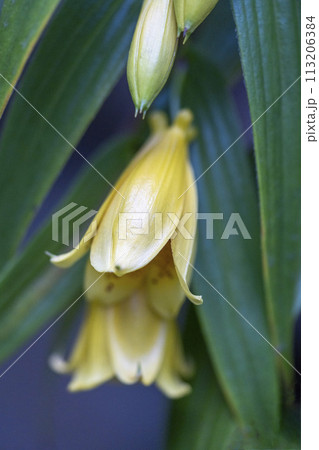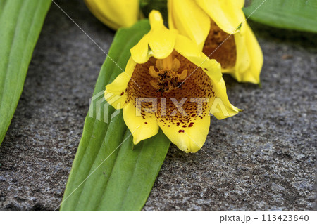 釣鐘状の黄色い花を咲かせるキイジョウロホトトギス