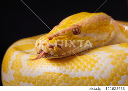 Close-up of a yellow python against a black background showing its brightly colored scales, Tree Snake.
