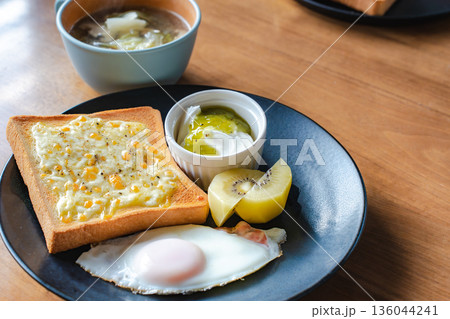 カフェ風モーニングの朝食プレート トーストと目玉焼きを並べる