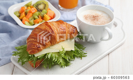 朝食, トースト, スクランブルエッグ, ハム, キウイ, フルーツ, サラダ, レタス, スープ,