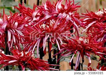 調布市の植物園に咲く中輪で赤いエドギク(江戸菊・古典菊)