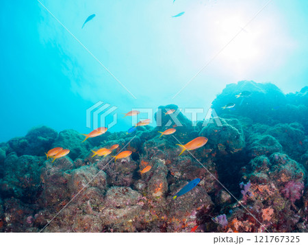 美しいアカハタ、ソラスズメダイ他の群れウミトサカ、イボヤギ他のソフトコーラルが群生する岩礁 ヒリゾ浜