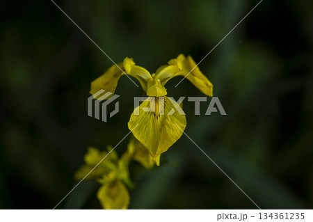 黄色い花菖蒲の花のクローズアップ 【鯉のぼり背景】