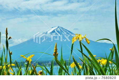 花と富士・キショウブの花近景に初夏の富士・横位置