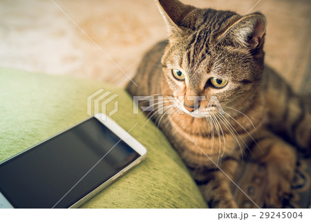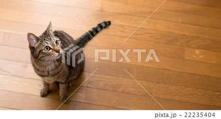 意識して、少し緊張しているキジトラ猫さん。猫のいる暮らし。イメージ素材