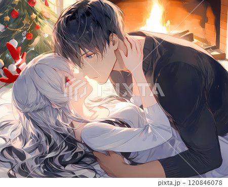 クリスマスをひっそりと過ごすカップル。アルビノの少女と碧眼の青年の聖夜。日本のアニメ風のAIイラスト