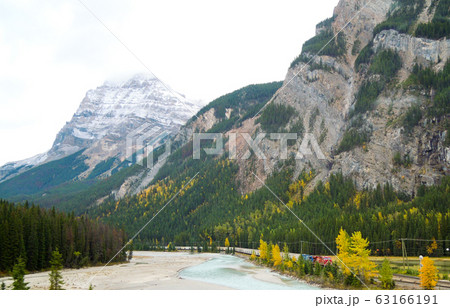 秋のカナディアンロッキー 黄葉のキッキング・ホース川と貨物列車(ヨーホー国立公園 カナダ)