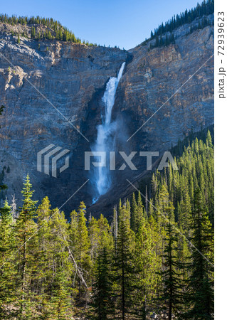 Takakkaw Falls Waterfall in a sunny summer day. 2nd tallest waterfall in Canada. Natural scenery landscape in Yoho National Park, Canadian Rockies, British Columbia.