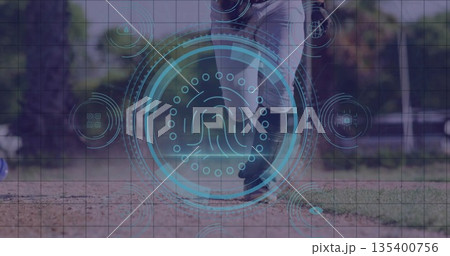 Sliding player in cleats on diamond in park, showing fingerprint icon overlay as biometric HUD
