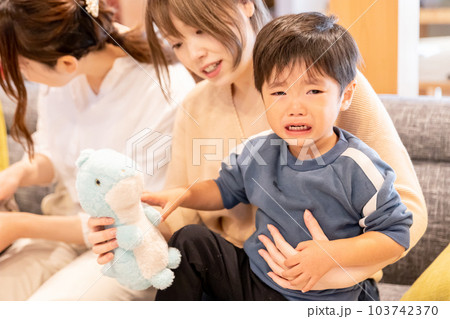 イヤイヤ期の男の子をぬいぐるみであやす母親・親子・ママ友・子供