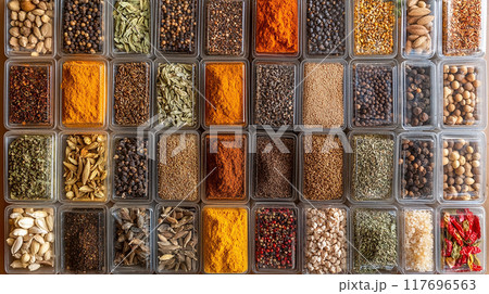 色とりどりのスパイスとハーブのボックスディスプレイ