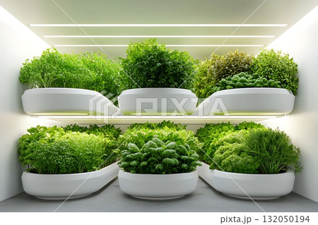 Modern Indoor Hydroponic Garden with Vibrant Green Leafy Plants in Stylish White Planters