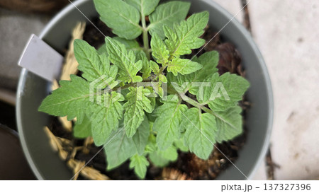 Young tomato seedling growing in container on terrace garden. Top view of Solanum lycopersicum plant in early development stage cultivated for homegrown vegetables and urban gardening.