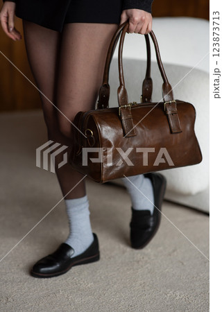 A girl in a black short skirt, nylon tights, and black shoes is posing with a brown bag.