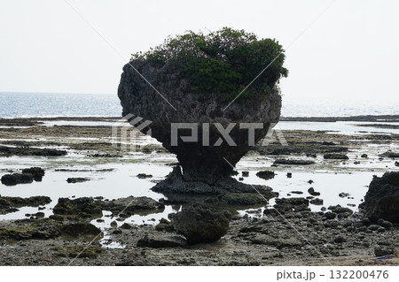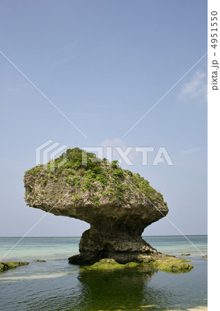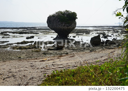 海岸にキノコの形をした岩がある風景 10月沖縄本島311キノコ岩・知念岬公園