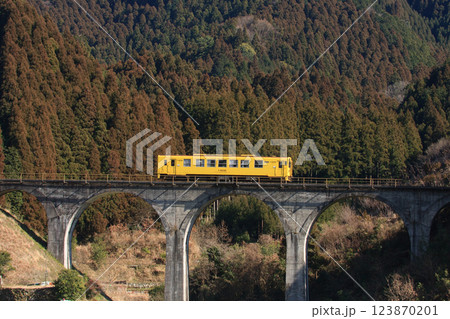 色付く山を背景に一六曲がりを行く黄色の列車(JR九州 キハ125形)
