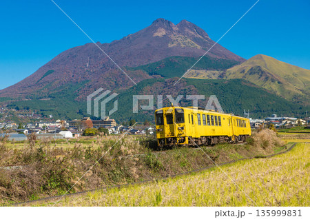 春霞の由布岳と黄色の列車(JR九州 キハ125形)