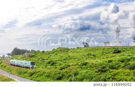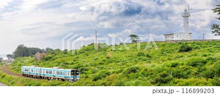 鮫角灯台、うみねこライン、JR八戸線の普通列車(青森県八戸市)