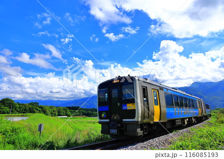 夏の空と小淵沢の高原を走る小海線
