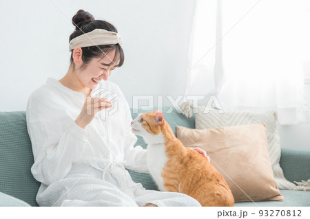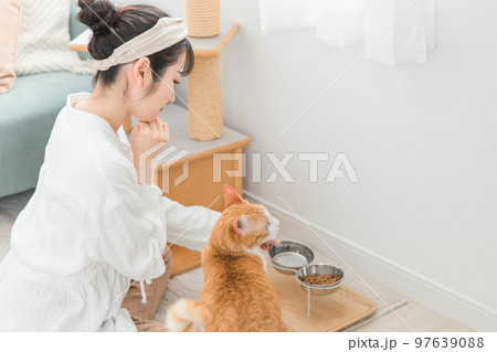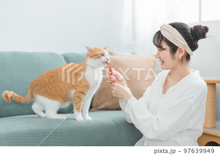 家・猫カフェで猫におやつをあげる日本人女性(餌)