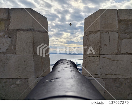 Seaside cannon view, Ancient maritime defense piece overlooking rough sea horizon during stormy weather