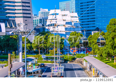 日本の横浜都市景観 桜木町駅前から総帆展帆の日本丸や水陸両用バス、ロープウェイなどを望む=3日