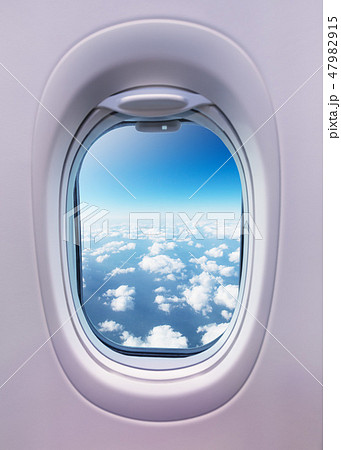 Airplane window with clouds. Background on the theme of tourism and travel.