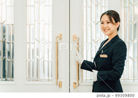 結婚式場のドアを開けるウェディングプランナー・ドアスタッフ・ホテリエの女性(結婚式スタッフ)