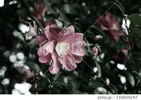 木陰に咲く桃色の椿の花 1月 モノクローム
