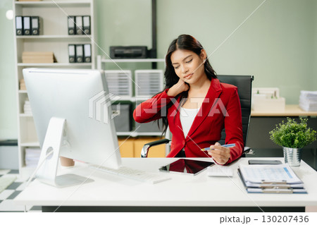 Overworked young Asian businesswoman office worker suffering from neck pain after had a long day