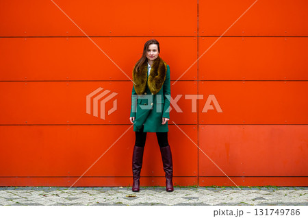 elegantly dressed business woman near a orange wall of a modern office building, space for text