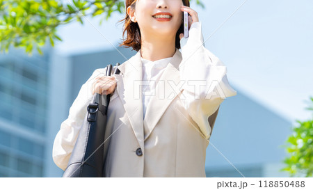 スマホで話す笑顔の女性・ビジネスウーマン