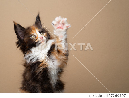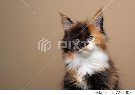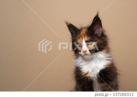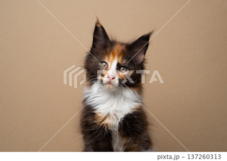 black tortie maine coon kitten sitting on fake fur looking at camera