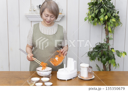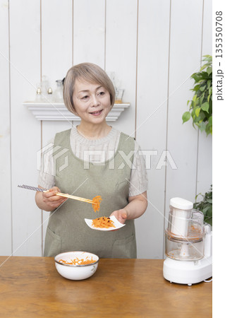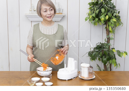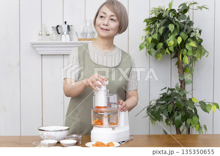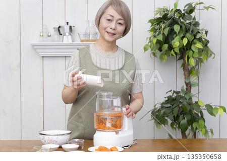 キッチンでフードプロセッサーを使い料理をするシニア女性