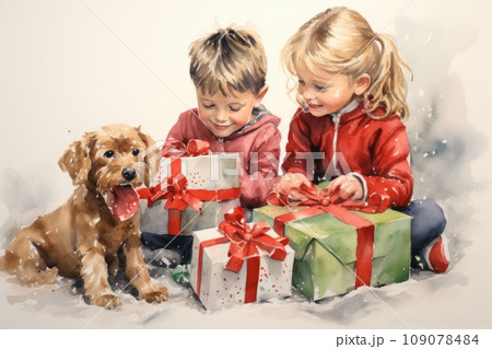 A heartwarming watercolor illustration of children discovering the presents left by Santa on Christmas morning.
