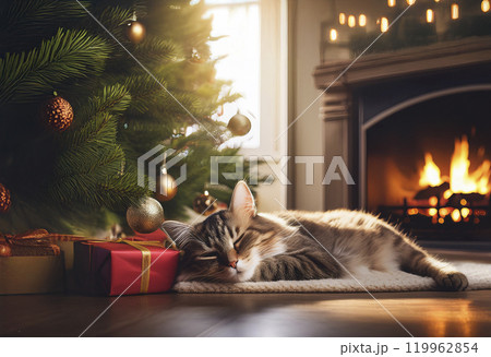 クリスマスツリーと暖炉で温まる猫 クリスマスの風景